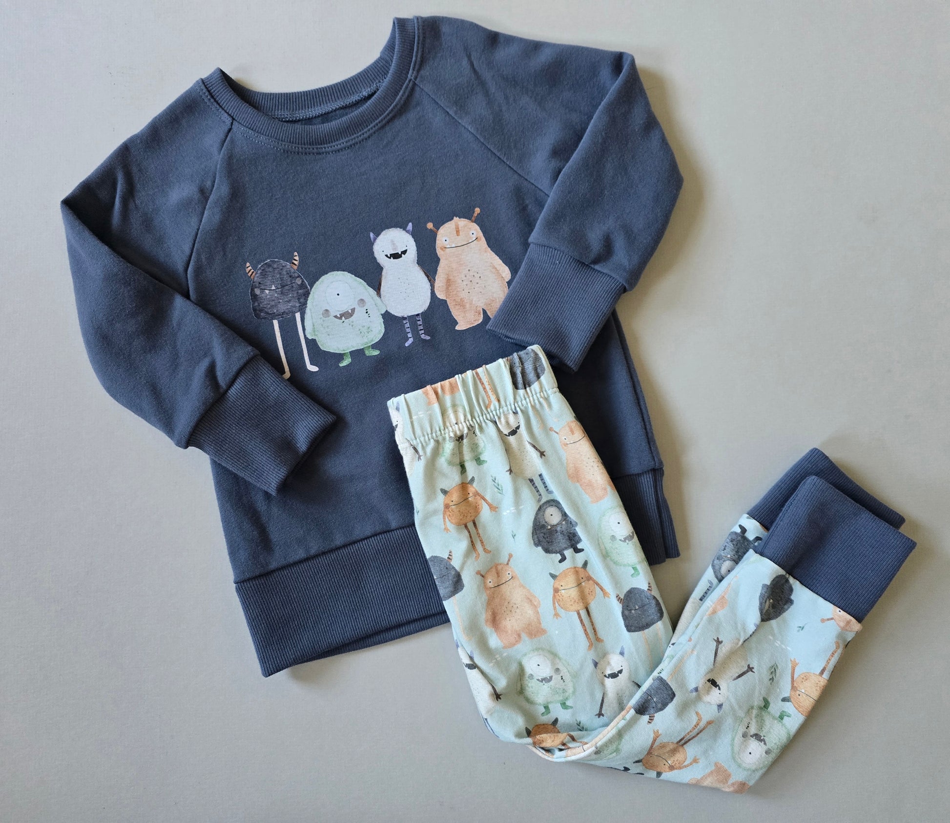 Handmade long sleeve raglan pullover cut from soft, high quality, organic cotton fabric with a heat transfer that won't crack, peel, or fade. Paired with coordinating pants made from organic cotton jersey knit.
