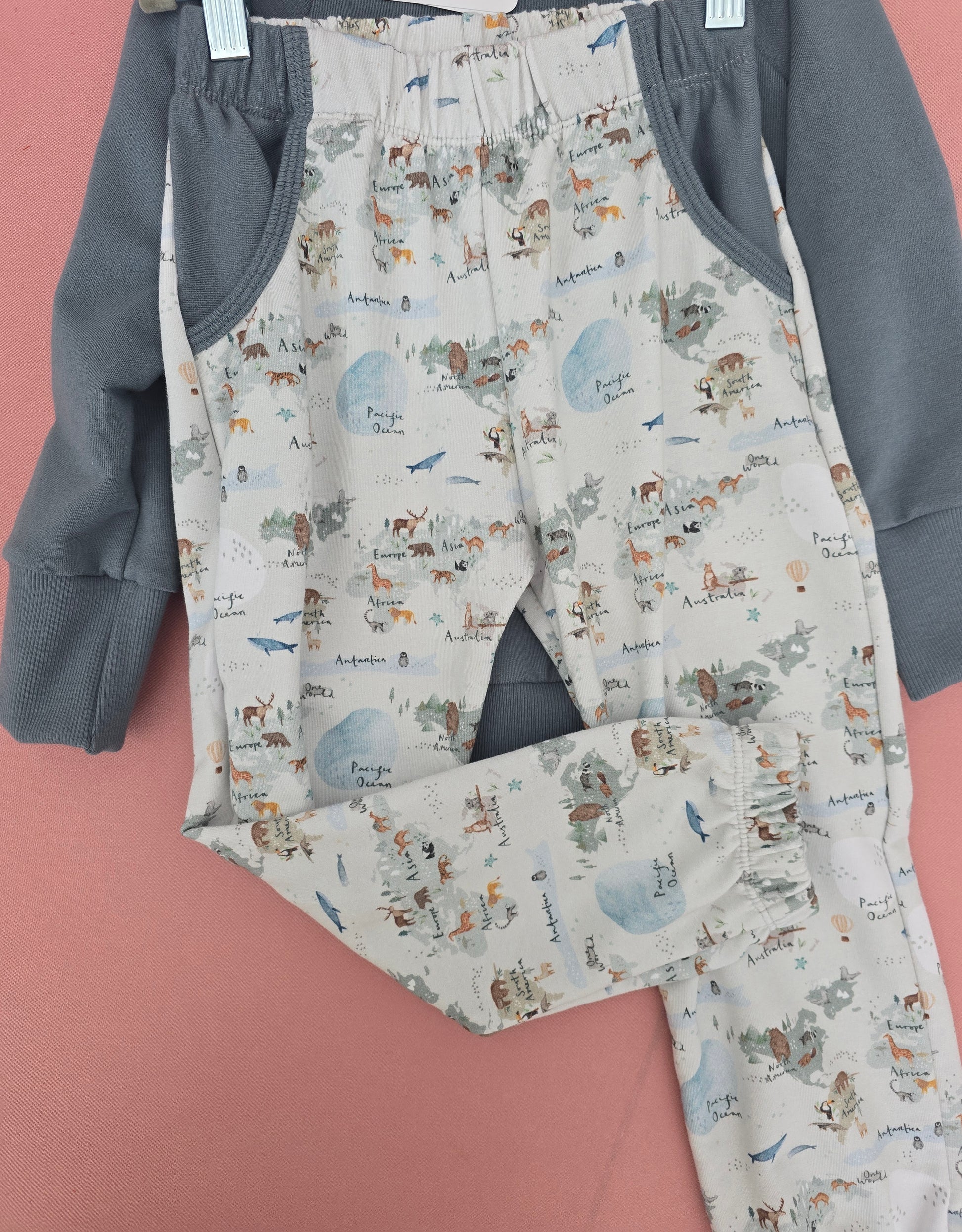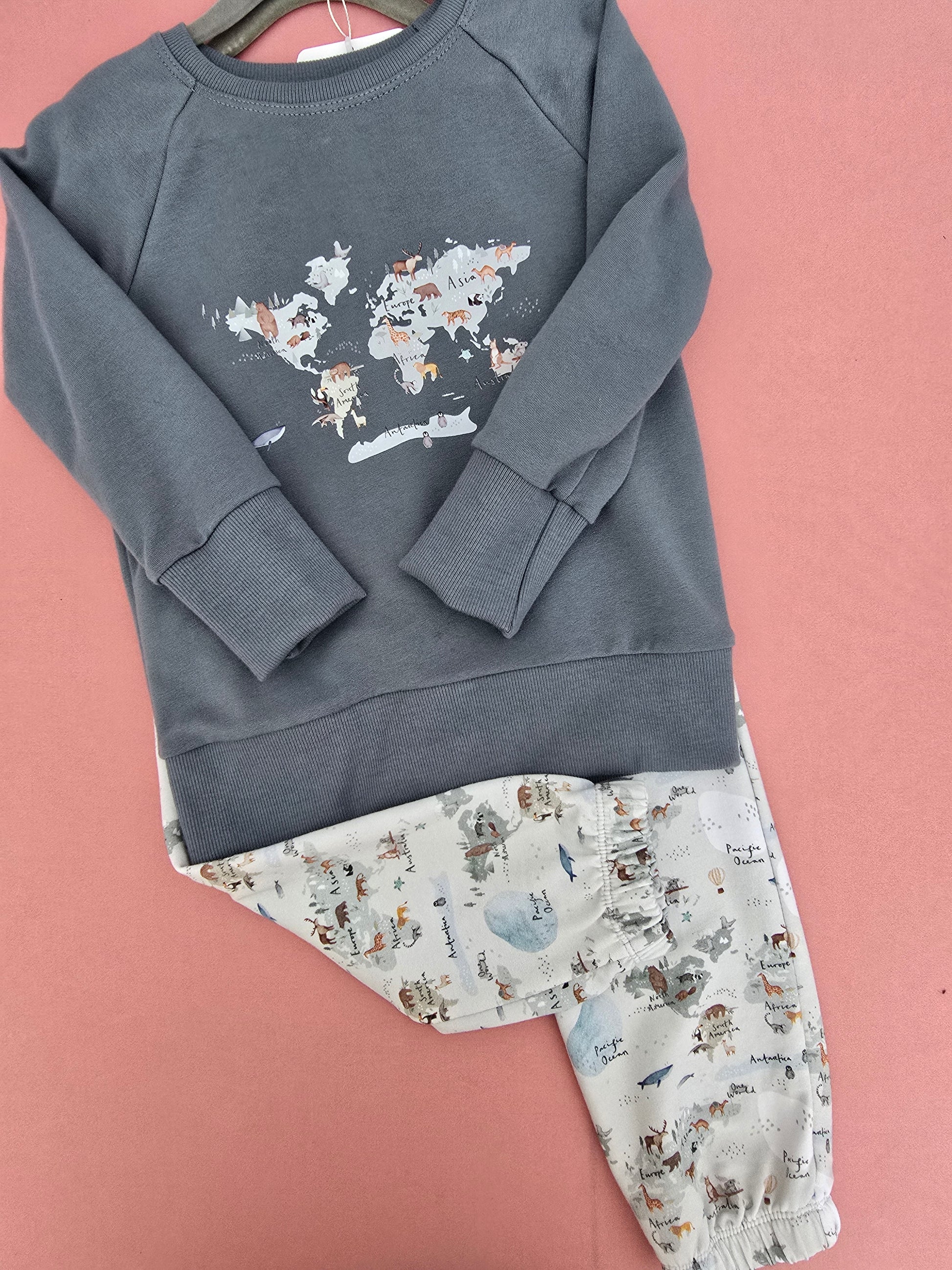 Handmade long sleeve raglan pullover cut from soft, high quality, organic cotton fabric with a heat transfer that won't crack, peel, or fade. Paired with coordinating pants made from bamboo cotton french terry knit.